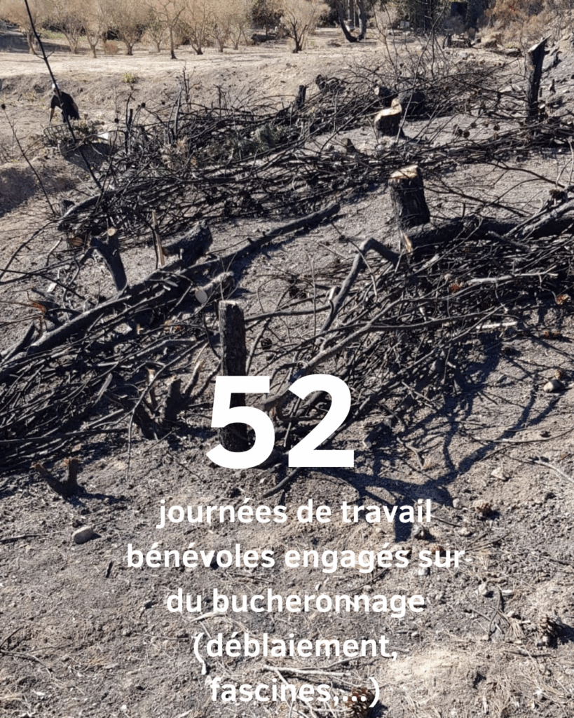 Une partie importante de nos chantiers était en rapport direct avec le bois : déblaiement, mise en place de fascines en réutilisant les branchages pour limiter le ruissellement de l’eau de pluie. Des actions de récolte et semis de graines d’arbres et arbustes ont également été menées, ainsi que la recherche de filières de plants forestiers pour trouver un maximum d’arbres à replanter.