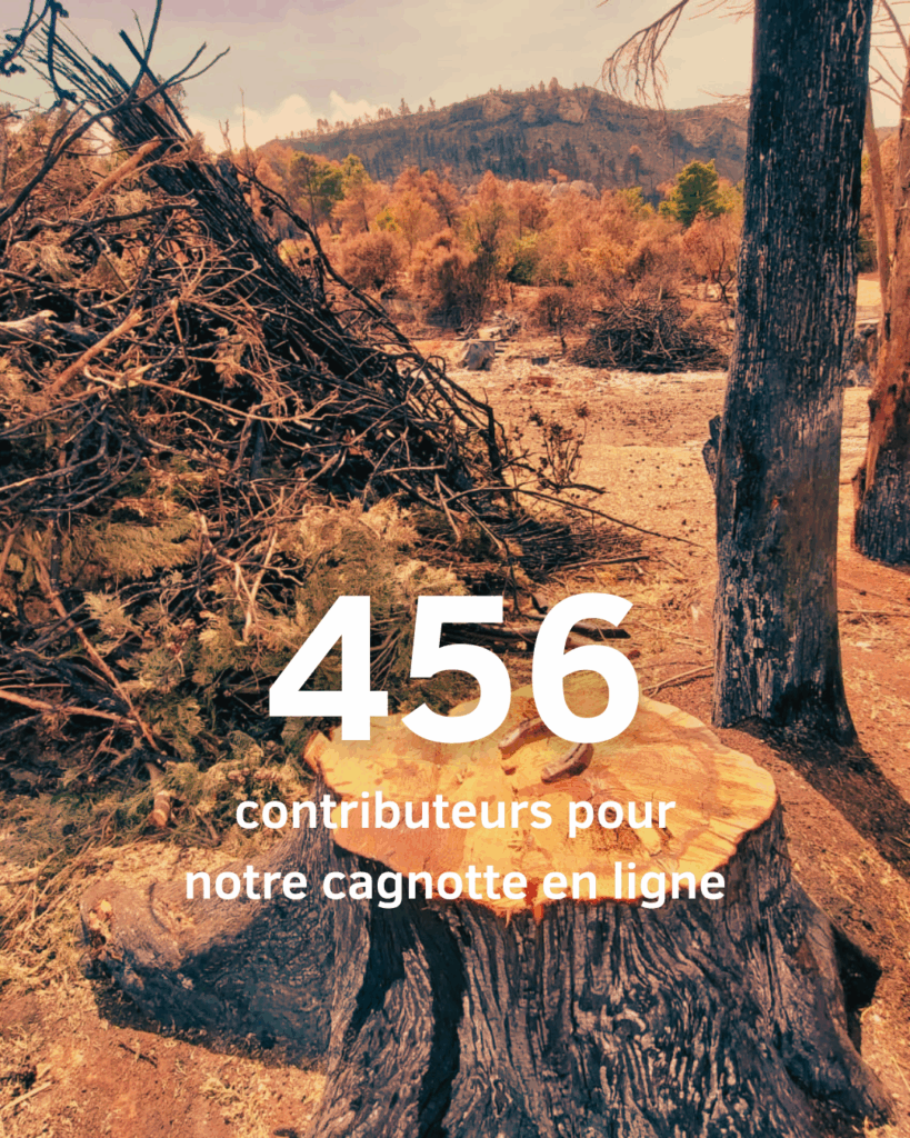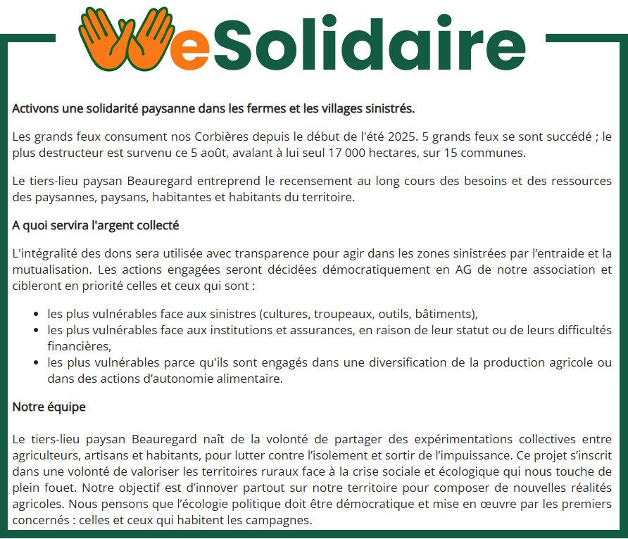 La cagnotte Corbières Solidaires Grands Feux collectée par le tiers-lieu paysan Beauregard a été relayée par nos partenaires locaux directement engagés dans l’action ou non, mais également par nos réseaux militants répartis sur le territoire national.