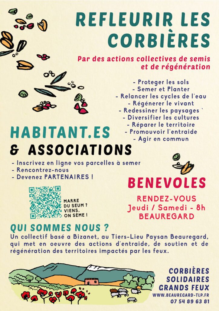 Pour casser ce cycle, le Tiers-lieu paysan Beauregard a engagé des actions de régénération en y associant les premiers concernés par les incendies : les habitantes et les habitants des Corbières. Nous les appelons à rejoindre nos chantiers de semis d’automne pour répondre dans l’urgence à la dégradation des sols brûlés en les couvrant de plantes annuelles.