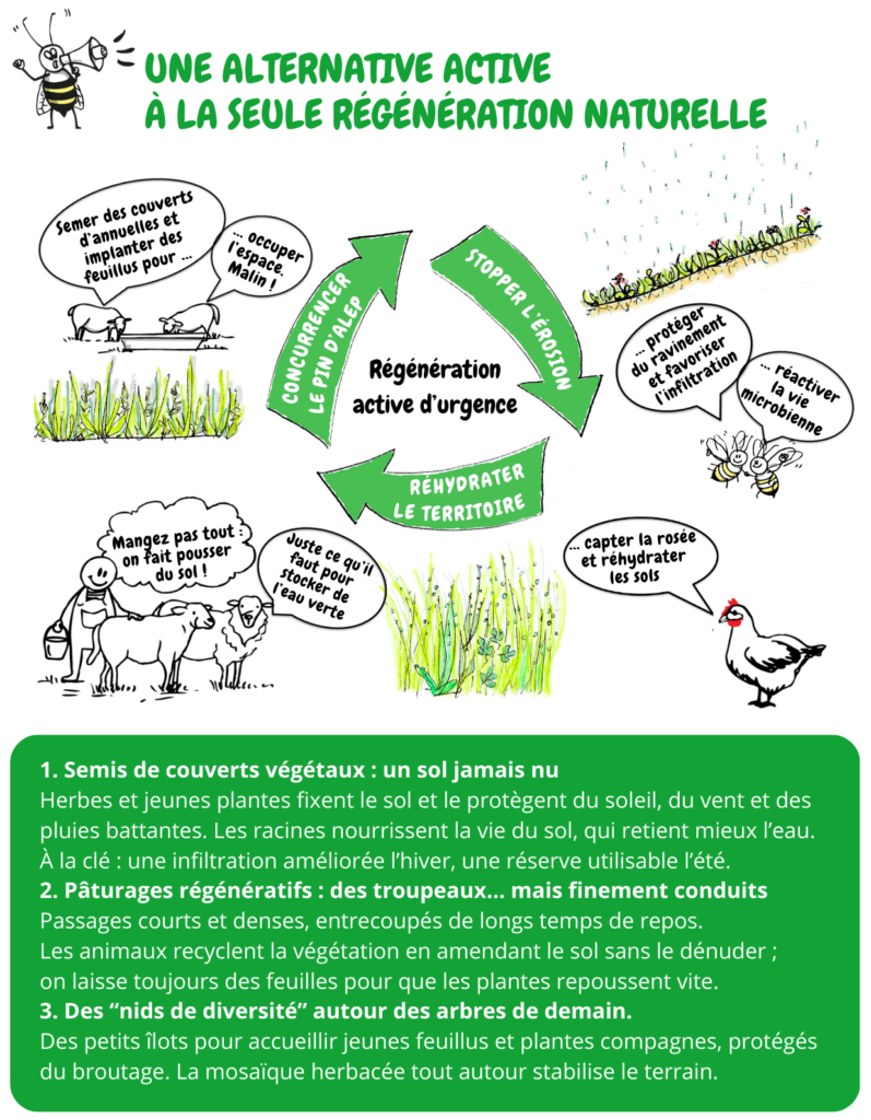 - Installer des agriculteurs et diversifier les productions, notamment par le développement du pâturage régénératif. L’élevage, conduit de manière appropriée, maintient les espaces ouverts et valorise des milieux dépréciés tout en restaurant les sols.