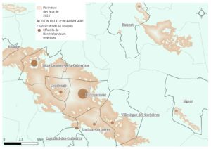 Pour recueillir la réponse à ces questions, nous avons mis en œuvre des actions d’arpentage : des équipes sont parties sillonner la zone touchée par les feux de l’été, village par village, pour rencontrer les sinistré.e.s, faire un état des lieux des pertes et des besoins, voir de quelle façon on pouvait venir en aide…