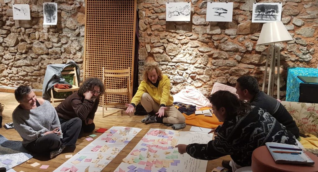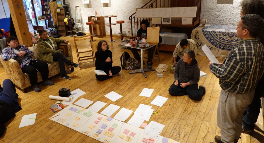 Dans le processus de création, nous privilégions un fonctionnement aussi horizontal que possible, inscrit dans une culture de l’autogestion et s’appuyant sur des outils de l’éducation populaire. À partir de l’écoute des témoignages, nous avons notamment construit une frise chronologique des étapes de régénération : d’abord par des nuages de mots réalisés avec des post-it, puis par un travail de synthèse autour de mots-clés. Cette démarche nous a permis de matérialiser le message que nous choisissions de servir.