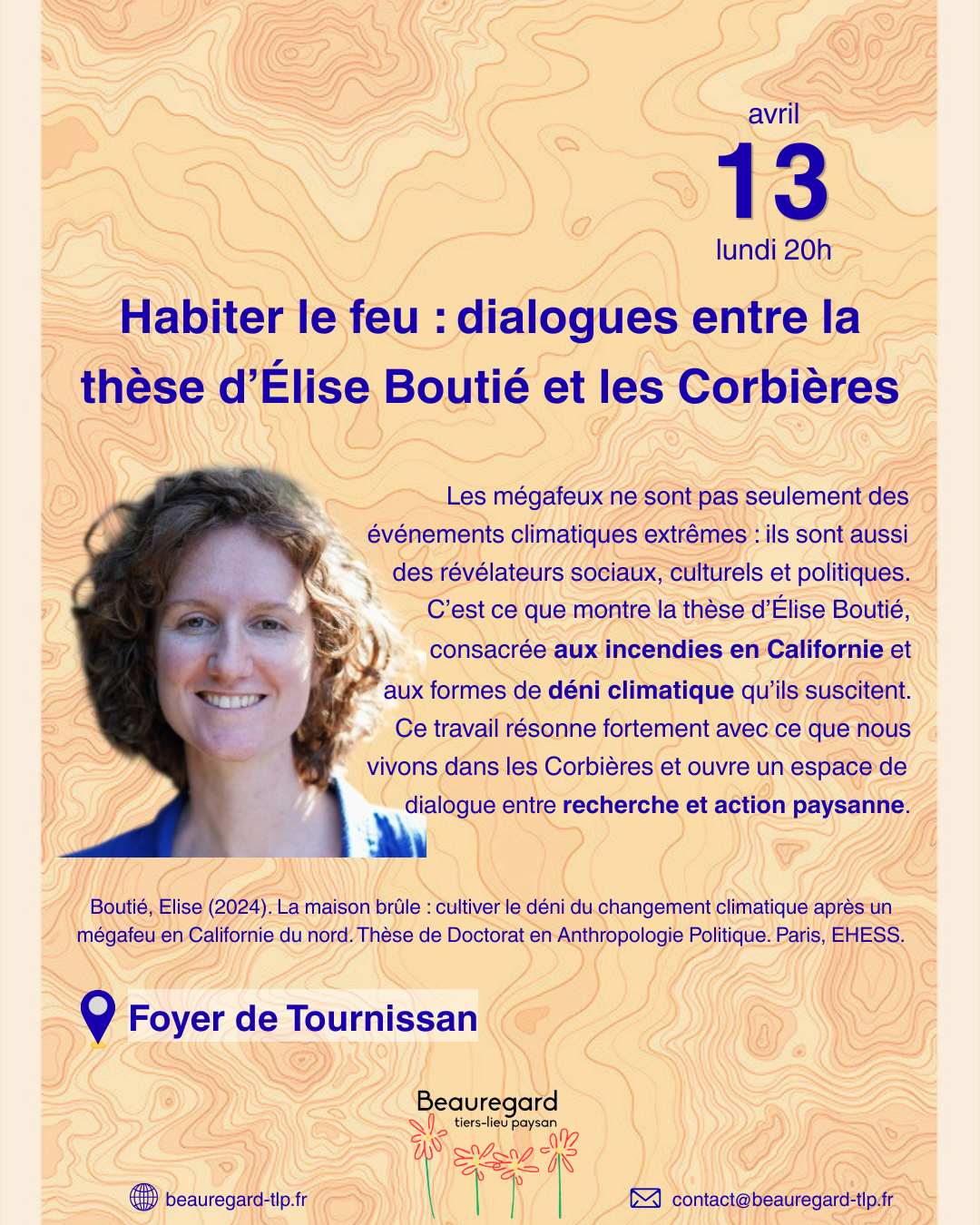 Pour s'inscrire : https://forms.gle/yVRpx4qAXtSSKnKs7 Présentation des travaux d'Elise Boutié, suivie de discussions autour de la situation dans les Corbières. Boutié, Elise (2024). La maison brûle : cultiver le déni du changement climatique après un mégafeu en Californie du nord. Thèse de Doctorat en Anthropologie Politique. Paris, EHESS. Les mégafeux ne sont pas seulement des événements […]